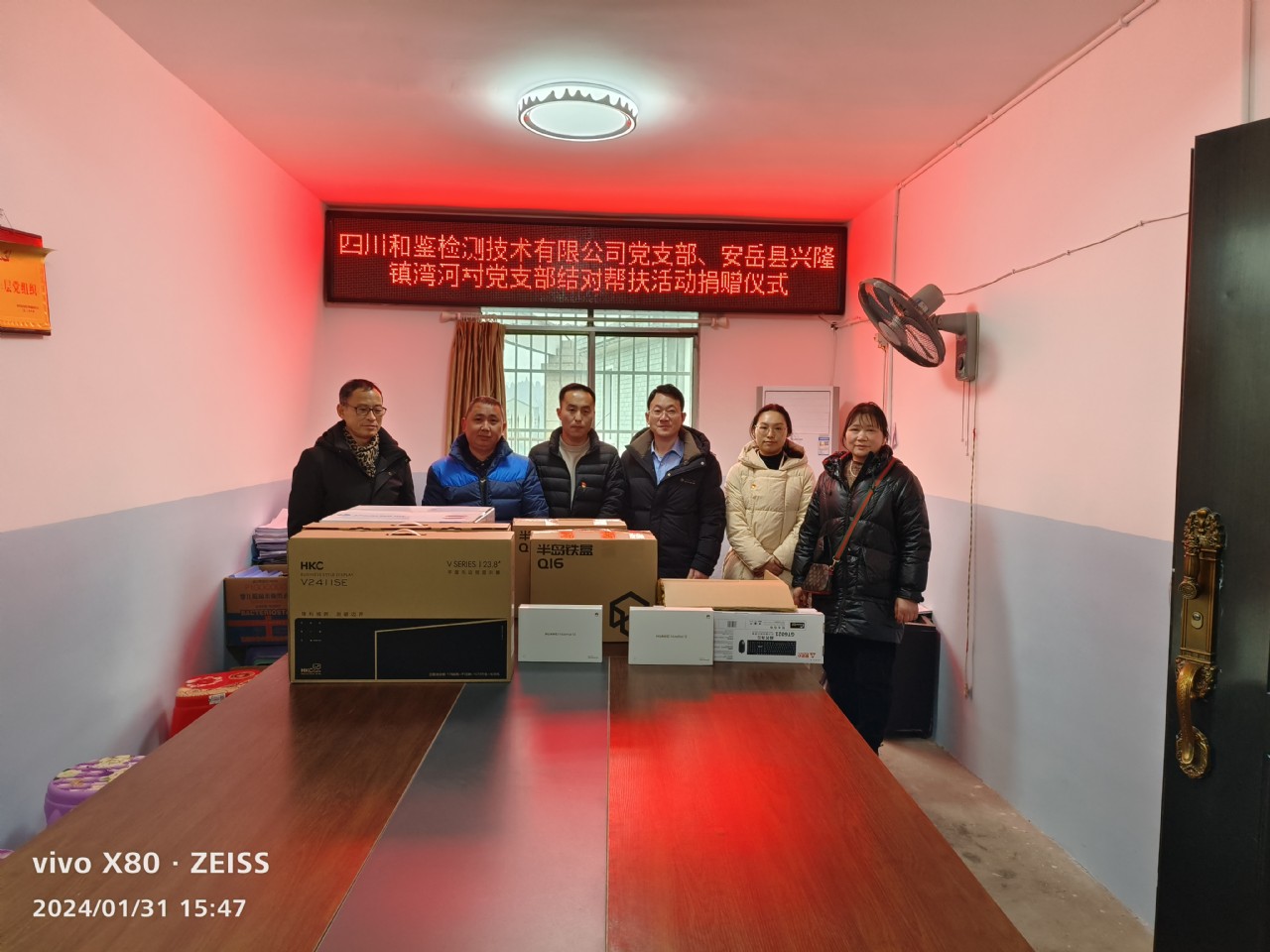 1月31日下午,公司支部书记赵飞云、行政人员魏美程一行代表中共四川和鉴检测技术有限公司支部、四川和鉴检测技术有限公司向湾河村党支部捐赠台式电脑、打复印一休机、平板电脑共计5台,价值10600元,用于支持湾河村党支部开展“三会一课”、党内政治生活、党内统计、党费收缴、学习强国平台学习等工作。